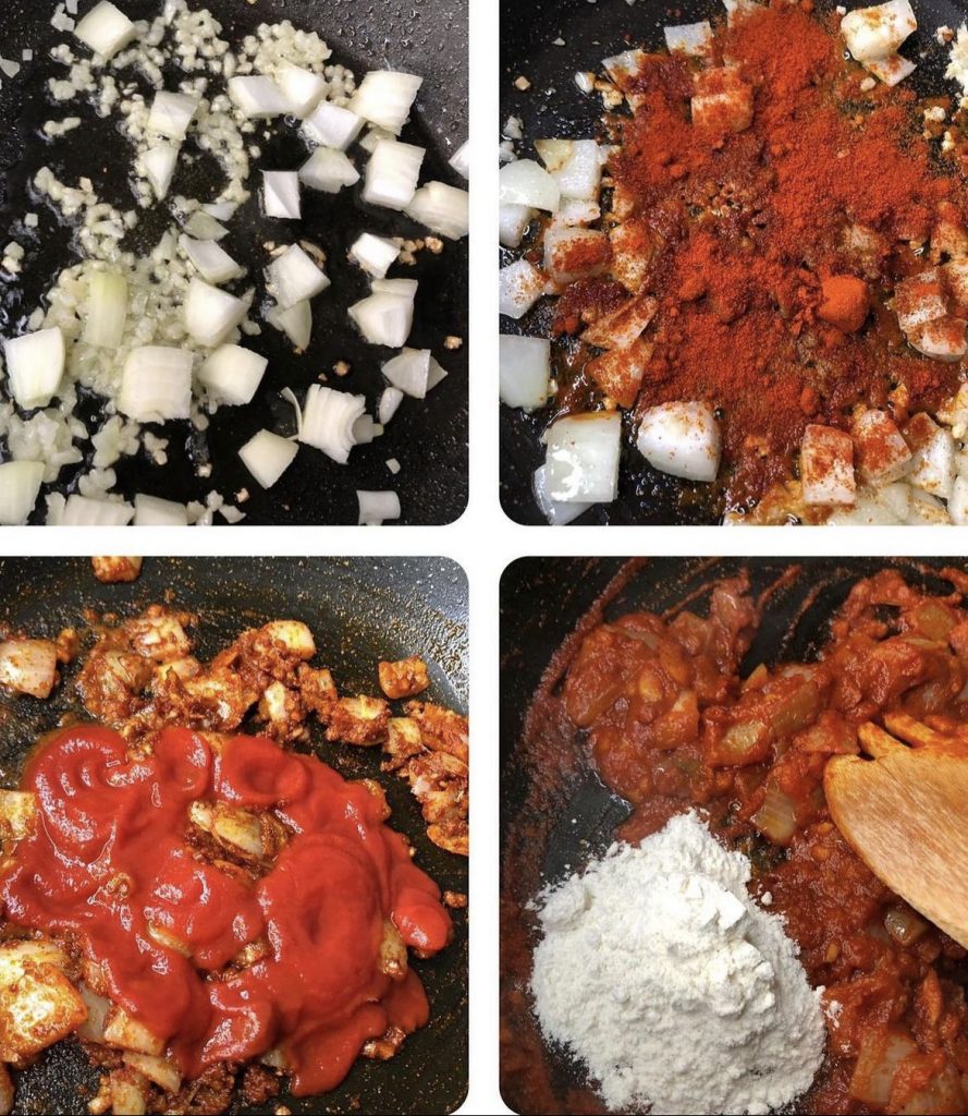 – couper 2 petits oignons et faire revenir dans de l’huile avec l’ail remuer