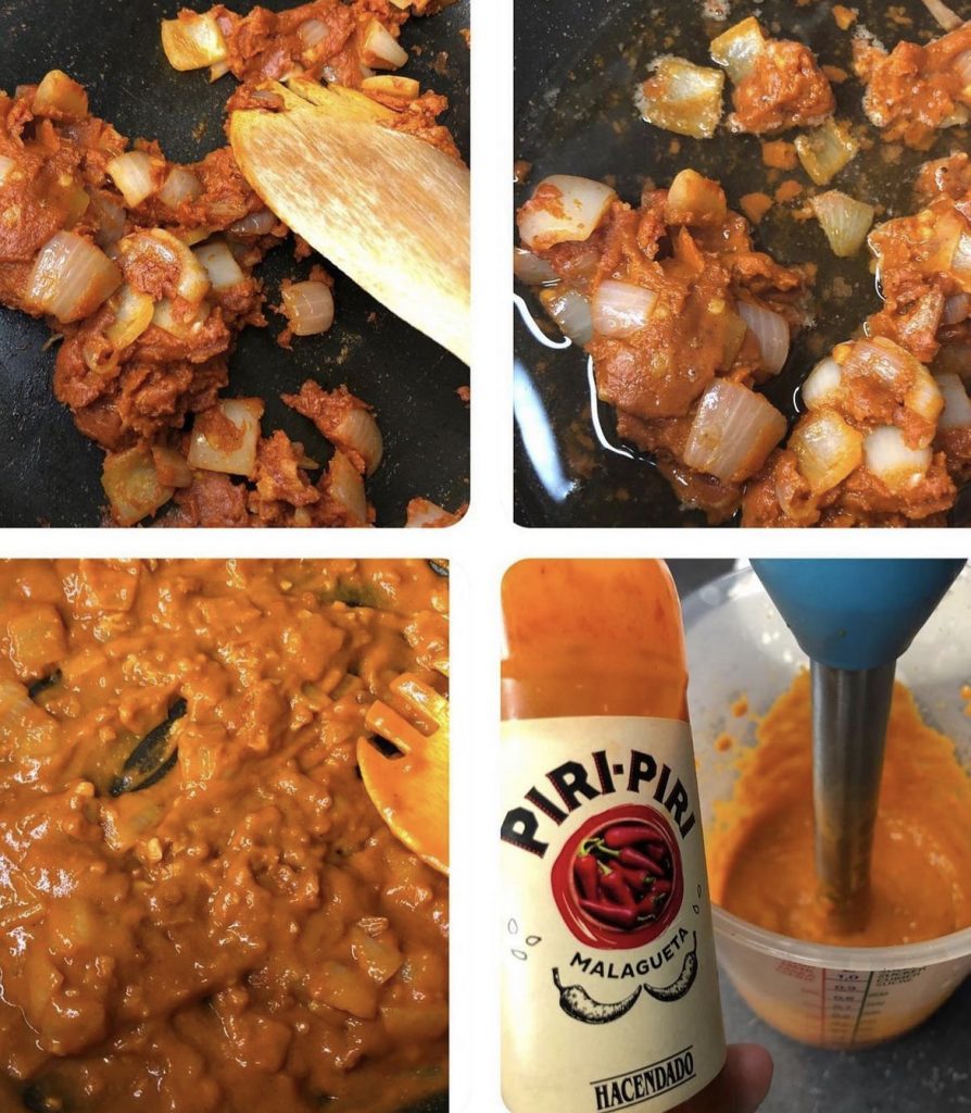 – mettre dans un récipient ajouter 3 goutés de tabasco ou si vous avez du piri piri et mixer au mixeur plonger