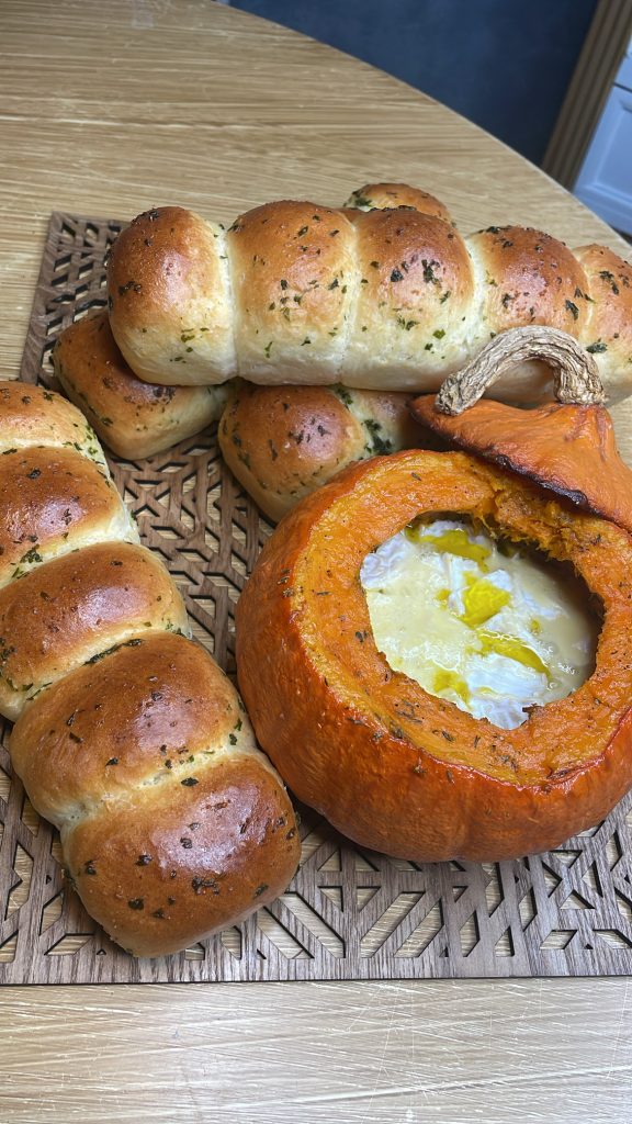 POTIRON RÔTI AU CAMEMBERT ET PAINS À L’AIL MAISON